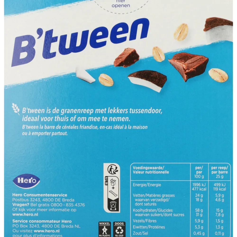 Hero B’tween Mueslireep Kokos & Chocolade is een heerlijke granenreep met kokos voor als je nog even door moet. Een lekker en voedzaam tussendoortje op basis van granen. Ideaal voor een boost onderweg, op school, op het werk of bij het sporten.