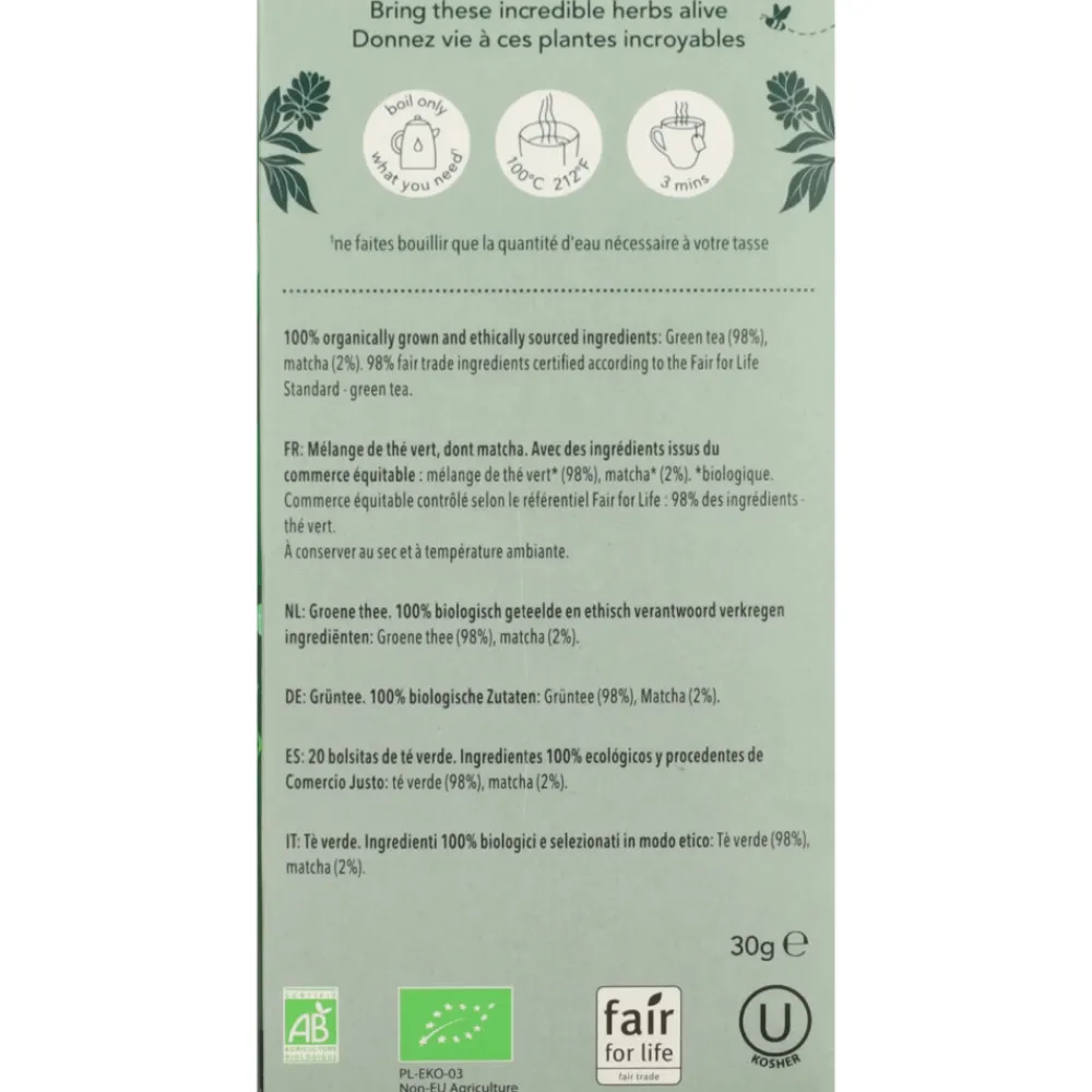 Een zeer bijzondere en rijke groene thee. Zuiver en eerlijk. De Pukka theeën zijn gebaseerd op de helende kracht van de aloude Ayurvedische leer van evenwicht en harmonie. Alle ingrediënten zijn biologisch en ethisch verantwoord geproduceerd. Voor ieder moment en elke stemming of behoefte is er een theevariant. Met recht een superieure groene thee, deze Pukka Supreme Matcha Green. De thee is samengesteld uit drie soorten hele theeblaadjes (Sencha uit China, Oothu uit de Indiase West-Ghats en Suoi Gang uit Vietnam), gemengd met het kostbare groene theepoeder Matcha. Een krachtige en versterkende motor voor vitaliteit en levenslust!