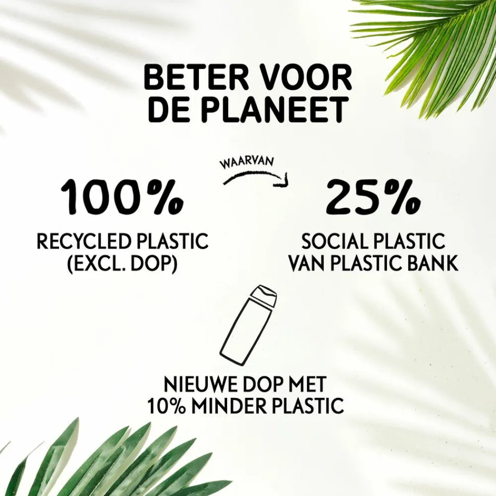 - De verpakking bestaat uit 100% gerecycled plastic (excl. dop), waarvan 25% social plastic
