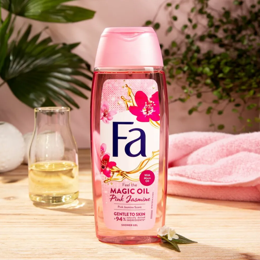 Ontdek Fa Magic Oil Pink Jasmine douchegel met de heerlijke geur van roze jasmijn. De vegan formule bevat 94% ingrediënten van natuurlijke oorsprong (incl. water).