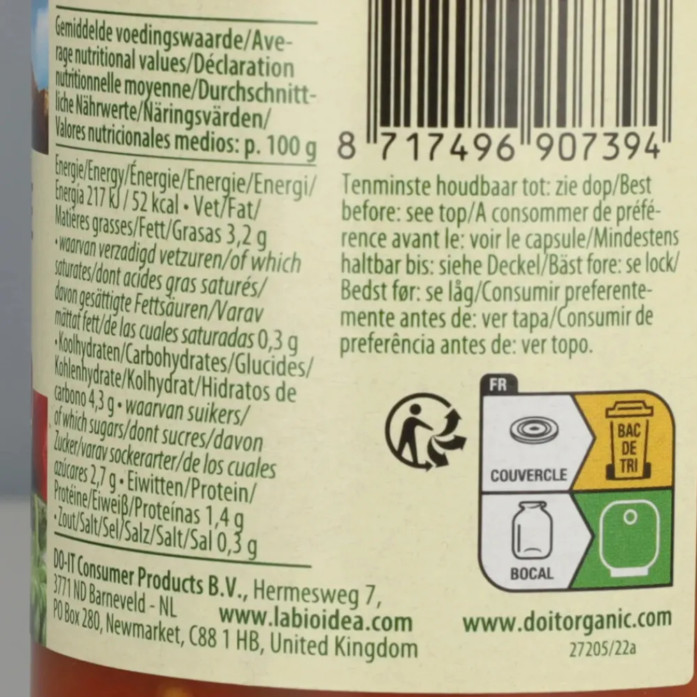 Tomaten* (40%), aubergine*(15%), courgette* (15%), paprika* (14%), uien* (10%), knoflook* (1%), zonnebloemolie*, basilicum*, zeezout.