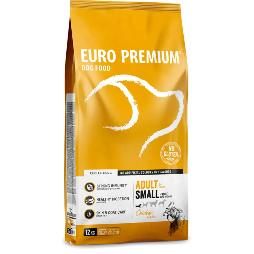 Euro-Premium Adult Small – Chicken & Rice is een volledige, super-premium voeding voor volwassen honden van kleine rassen (vanaf 1 jaar en tot 10kg volwassen gewicht). Deze energierijke voeding is speciaal samengesteld voor honden die een kleiner brokje verkiezen.