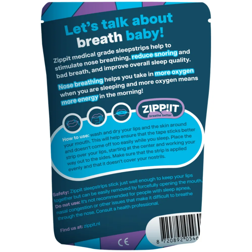 Zippit Mondtape helpt de neusademhaling te stimuleren. Door de pleister, met een kleine opening, over je mond te plakken word je gedwongen om door de neus te ademen. Hierdoor vermindert snurken en de slechte adem in de ochtend. Daarnaast helpt de pleister de algehele slaapkwaliteit te verbeteren.