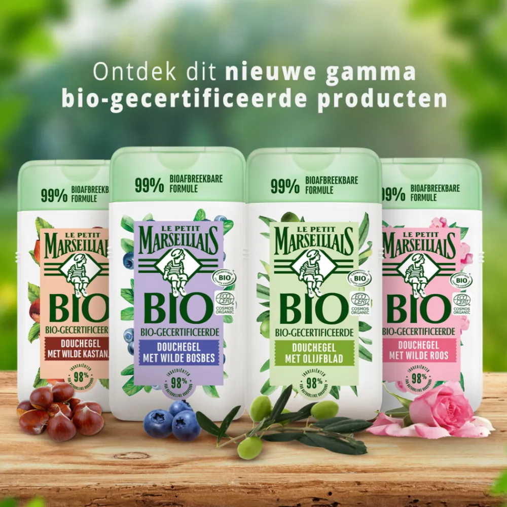 De inzet voor de natuur was er al. Nu gaat Le Petit Marseillais® nog een stapje verder in milieuvriendelijkheid met de lancering van zijn eerste assortiment biologische douchegels. Die bevatten lokaal geteelde ingrediënten en verspreiden de weldadige geur van de Provence. De nieuwe bio douchegels schuimen aangenaam en omhullen de huid met zachtheid. Ze prikkelen de zintuigen voor een stralende ervaring, zoals de zuiderse zon! De flacons van de nieuwe bio-gecertificeerde douchegels zijn 100% recyclebaar.