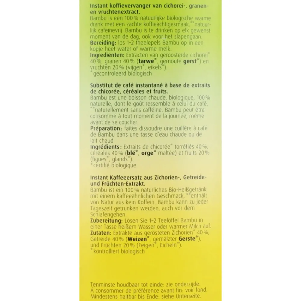 A.Vogel Bambu is een 100% natuurlijke koffievervanger gemaakt van chichorei, Turkse vijgen, tarwe, gemoute gerst en Griekse eikels. Een lekker en gezond kopje koffie voor elk moment dus. Je kunt A.Vogel Bambu met een gerust hart voor het slapen drinken. Doordat het geen caffeïne bevat, beïnvloedt deze koffie de slaap namelijk niet.