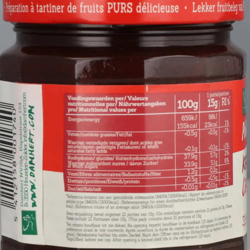 Bevat van nature aanwezige suikers. Bereid met 50g vruchten per 100g. De aanwezigheid van pitten of stukjes pitten blijft mogelijk in dit product.