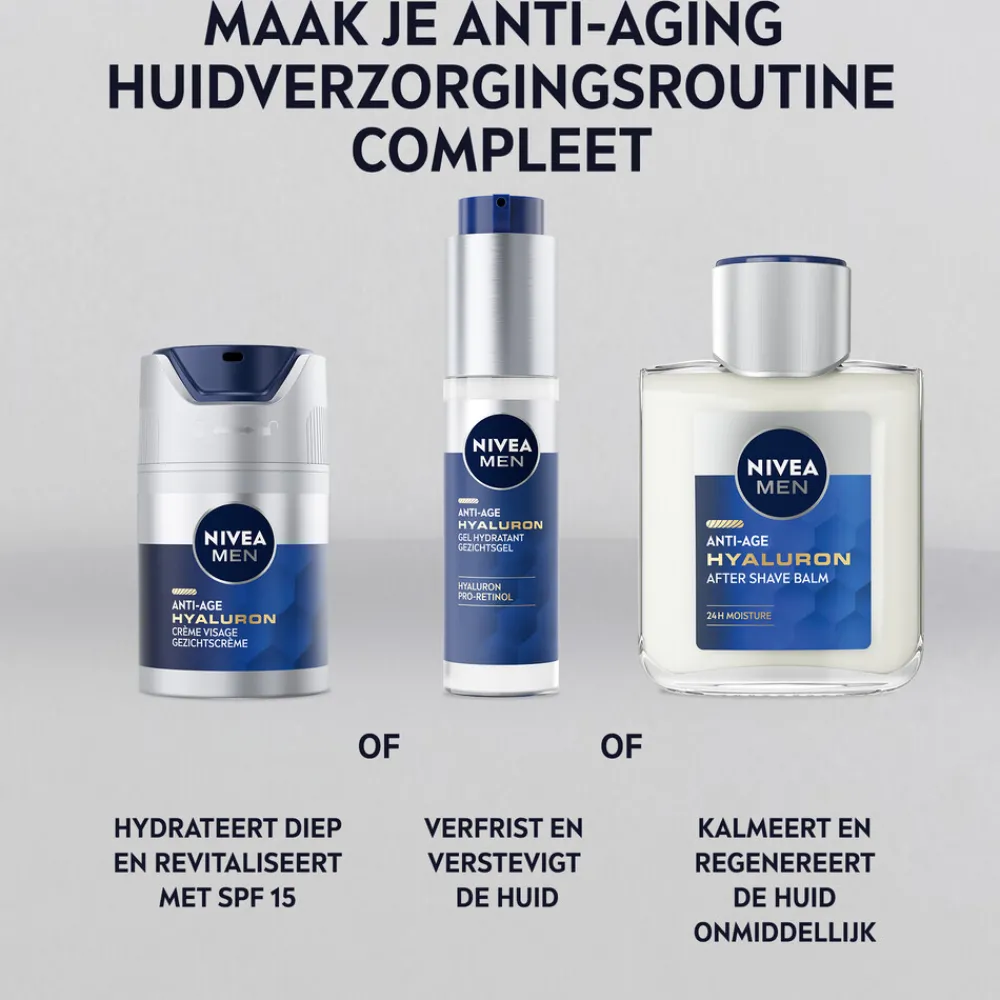 Nivea Men Hyaluron Hydraterende Anti-Age Gezichtsgel is een ideaal gezichtsverzorgingsproduct voor mannen die hun huid willen verstevigen en intensief hydrateren. Een Anti-Age-effect met de hoogste hyaluronzuurconcentratie binnen het Nivea Men Anti-Age HYALURON-assortiMent. De formule trekt snel in en is niet vet. De gel vermindert zichtbaar rimpels en verstevigt en revitaliseert de huid. Hydrateert intensief gedurende 24 uur.
