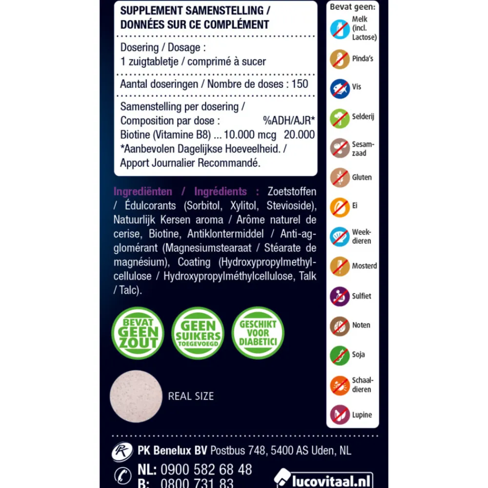 Lucovitaal Biotine 10.000 mcg Forte bevat 10.000 mcg Biotine (Vitamine B8) in een zuigtabletje met Kersensmaak.