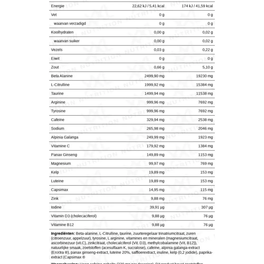Beta-alanine, L-Citrulline, taurine, zuurteregelaar trinatriumcitraat, zuren (citroenzuur, appelzuur), tyrosine, L arginine, vitamines en mineralen (magnesiumcitraat)ascorbinezuur (vit.C), zinkcitraat, cholecalciferol (Vit. D3), methylcobalamine (Vit. B12), natuurlijke smaak, zoetstoffen (acesulfaam K, sucralose), cafeïne, alpinia galanga-extract (EnXtra @), panax ginseng-extract, luteïne 20%, saffloerextract, inuline, kelp (0, 2 jodide), paprika- extract (Capsimax @)