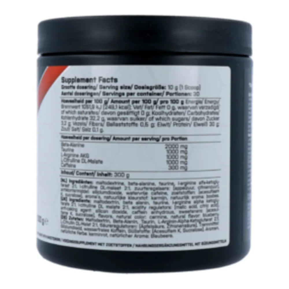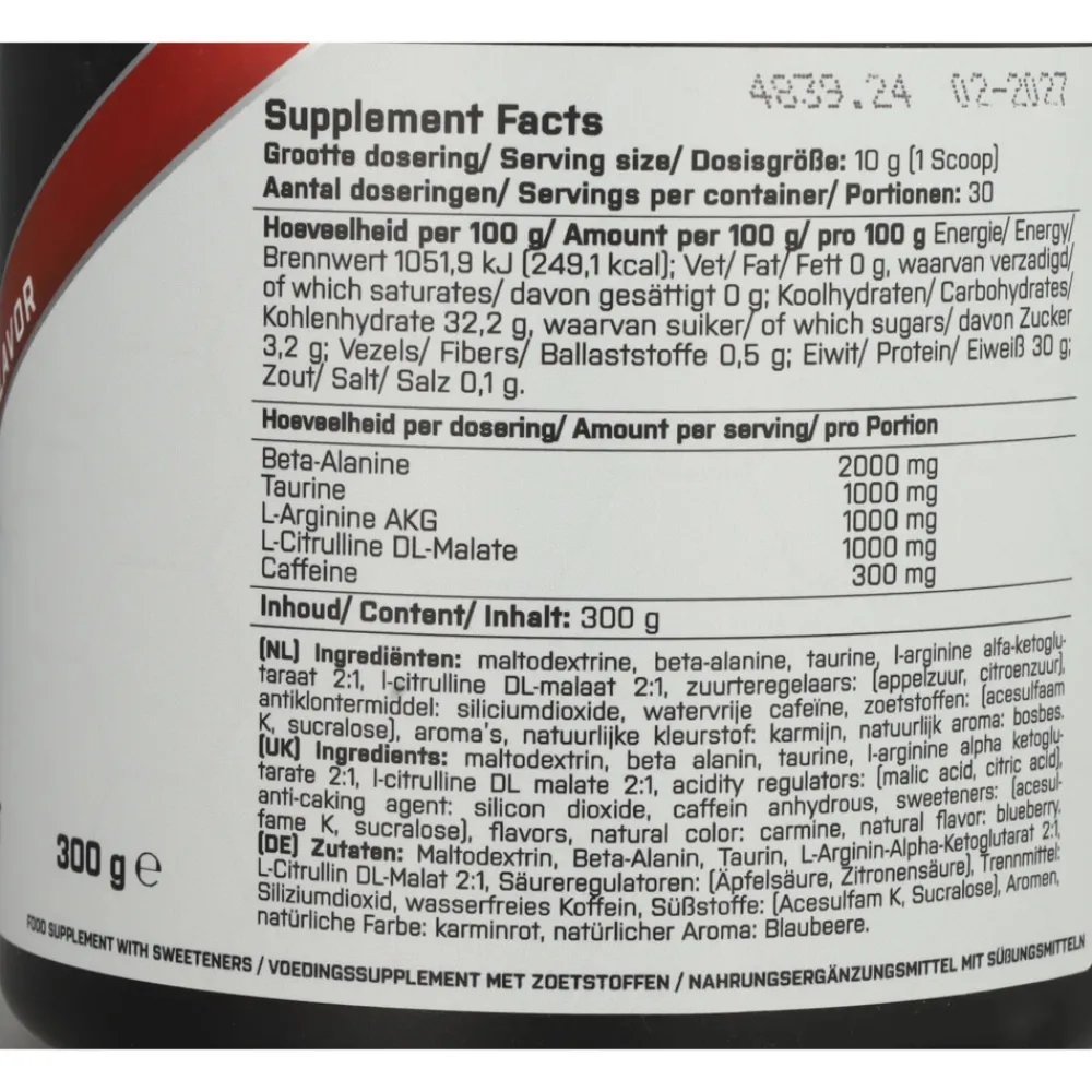 Maltodextrine, beta-alanine, taurine, L-citrulline DL-malaat, L-arginine AKG, zuurteregelaars: (appelzuur, citroenzuur), aroma, watervrije cafeïne, antiklontermiddelen (siliciumdioxide, magnesiumstearaat), zoetstoffen: (acesulfaam k, sucralose), tricalciumfosfaat, monokaliumfosfaat, kleur: natrium koperchlorofyline