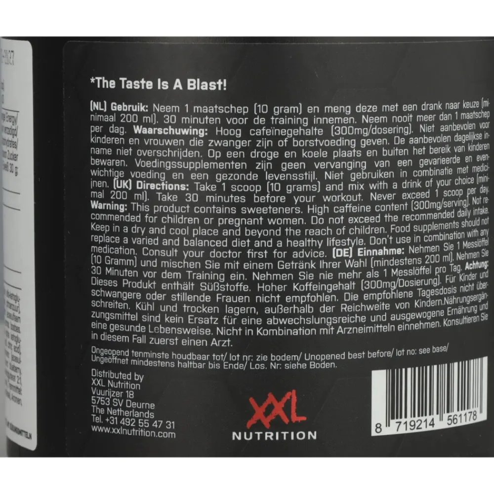 Let op: Blast Pre Workout is een voedingssupplement met zoetstoffen en bevat een hoog cafeïne gehalte (300mg per dosering). Niet aanbevolen voor kinderen en vrouwen die zwanger zijn of borstvoeding geven.