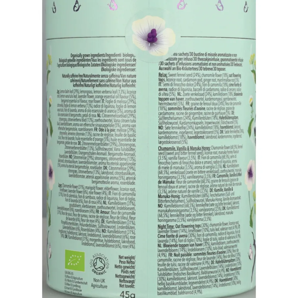 Natuurlijk cafeïnevrij en ethisch geproduceerd, biologisch Ingrediënten: Joy: Citroenmelisseblad (29%), citroengras (29%), citroenverbenablad (13%), zoethoutwortel, citroenvana tulsiblad (5%), lavendelbloem, sinaasappel aroma van etherische olie (5%), aroma van etherische olie van bergamot, rozenbloem. Night Time Berry: Rozenbottel, hibiscusbloem, kamillebloem (15%), lavendelbloem, zoethoutwortel, gemberwortel, echinaceablad en -wortel (6%), vlierbes (4%), zwarte bessenfruit (4%), valeriaanwortel, bosbessensmaak, zwarte bessensmaak. Relax: Zoet venkelzaad (24%), kamillebloem (18%), haverbloeiende toppen, zoethoutwortel, kardemompeul, gemberwortel, heemstwortel (5%). Peace: Kamillebloem, groene muntblad (36%), zoethoutwortel, lavendelbloem, ashwagandhawortel (5%), hennepzaadoliekorrels (4%). Chamomile Vanilla & Manuka Honey: Kamillebloem (68,5%), venkelzaad (zoete en bittere venkelzaad), zoethoutwortel, manukahoningaroma (3,5%), vanillearoma (3,5%).