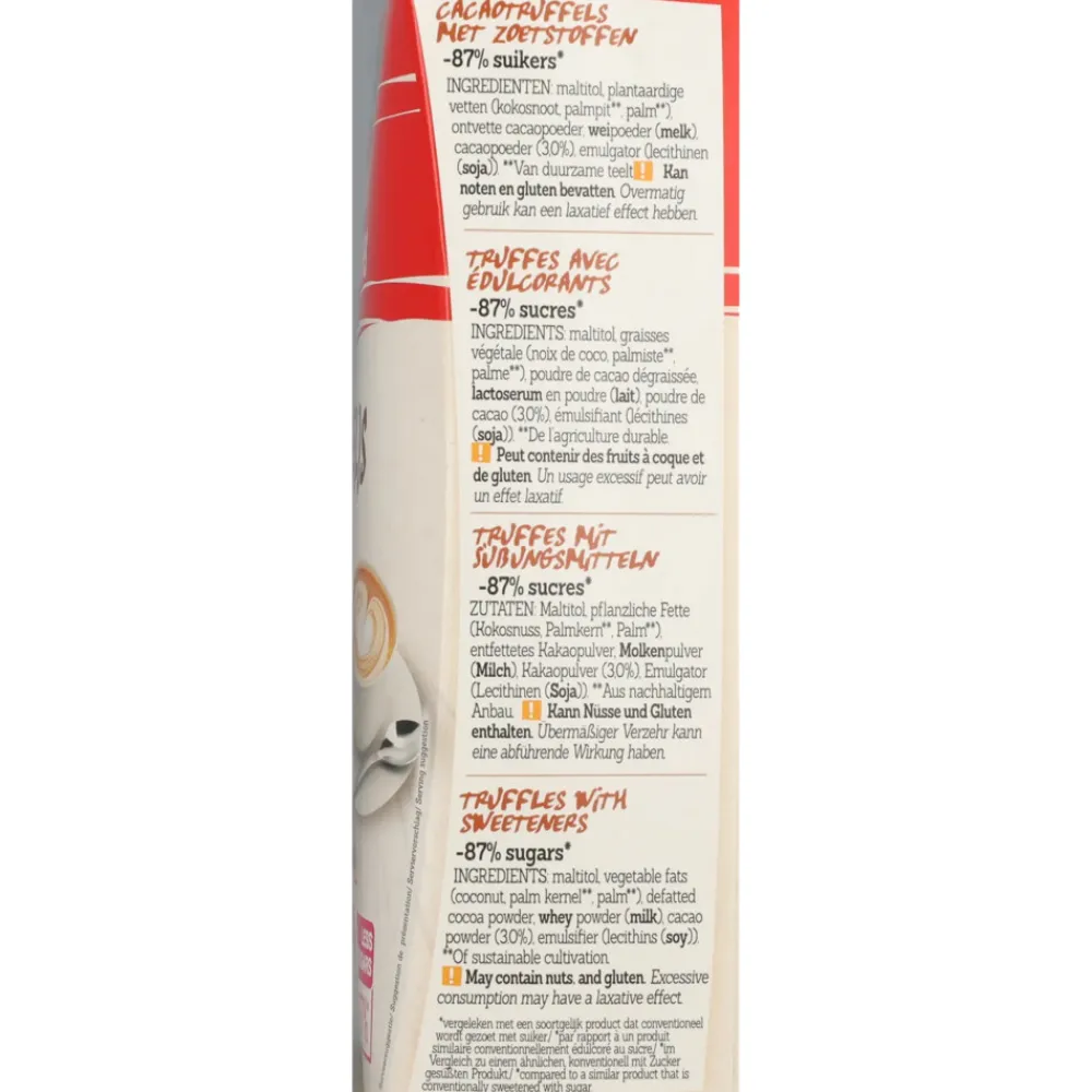 Damhert Truffels Minder Suiker zijn heerlijke chocolade cacao truffels met wel 87% minder suiker dan gewone chokplade truffels. Deze truffels van Damherrt zijn gezoet met malitol waardoor ze maar liefst 87% minder suikers bevatten.