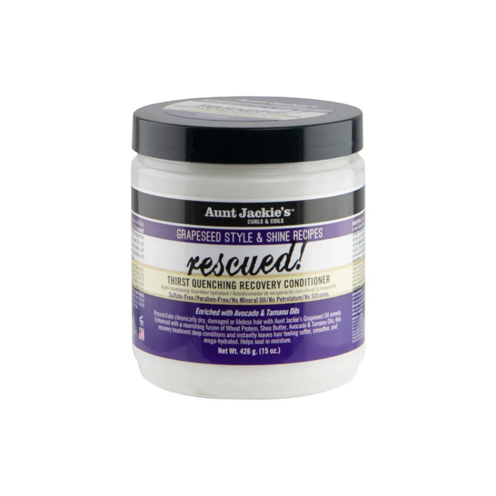 Aunt Jackie’s Rescued Thirst Quenching Recovery Conditioner is de ultieme redding voor droog en beschadigd haar. Deze hydraterende conditioner is verrijkt met druivenpitolie, sheaboter, argan-, avocado-, tamanu- en castorolie. Het voedt en herstelt het haar intensief. Het helpt haarbreuk te voorkomen, maakt het haar zacht, soepel en veerkrachtig en laat het weer stralen. De conditioner kan zowel als reguliere conditioner als deep conditioner worden gebruikt, afhankelijk van de behoefte van je haar. Dit product is vrij van sulfaten, parabenen, siliconen en minerale oliën. Na gebruik voelt je haar direct zachter aan en oogt het gezonder, waardoor je krullen weer tot leven komen.