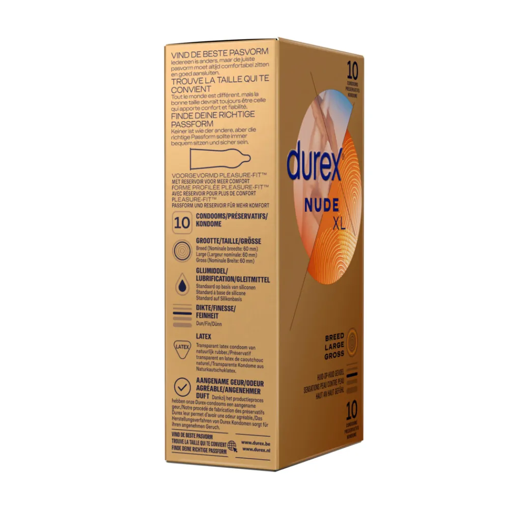 Iedereen is anders, maar de juiste pasvorm moet altijd comfortabel en veilig zitten. Daarom zijn Durex Nude XL condooms extra large, een comfortabele pasvorm voor mannen die een groter formaat nodig hebben dan onze Durex Nude Natural condoom.