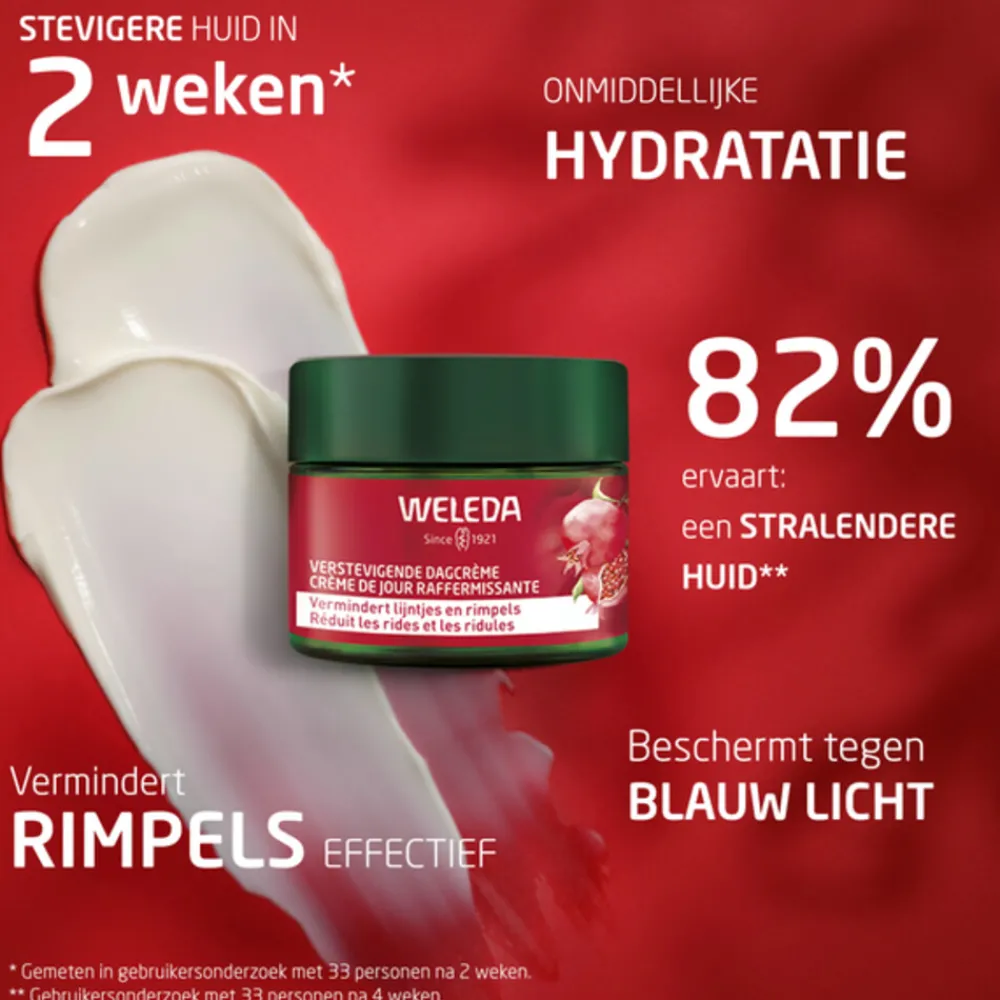 Naarmate je ouder wordt kunnen lijntjes en rimpels ontstaan. Deze natuurlijke dagcrème zorgt voor een stevige, stralende en gezonde huid. Biologische & 100% natuurlijke anti-age formule. Verstevigende Dagcrème met krachtige antioxidanten en peptiden stimuleert de celvernieuwing en de natuurlijke regeneratie van de huid. Met als resultaat een stevigere en gladdere huid met minder lijntjes en rimpels. Weleda Verstevigende Dagcrème is 100% natuurlijke verzorging voor de 40+ huid. Verstevigende Dagcrème met biologische granaatappelolie en peptiden van macawortel beschermt tegen vrije radicalen en blauw licht en verbetert de elasticiteit en spankracht van je huid. De crème trekt snel in en is goed verdraagzaam.