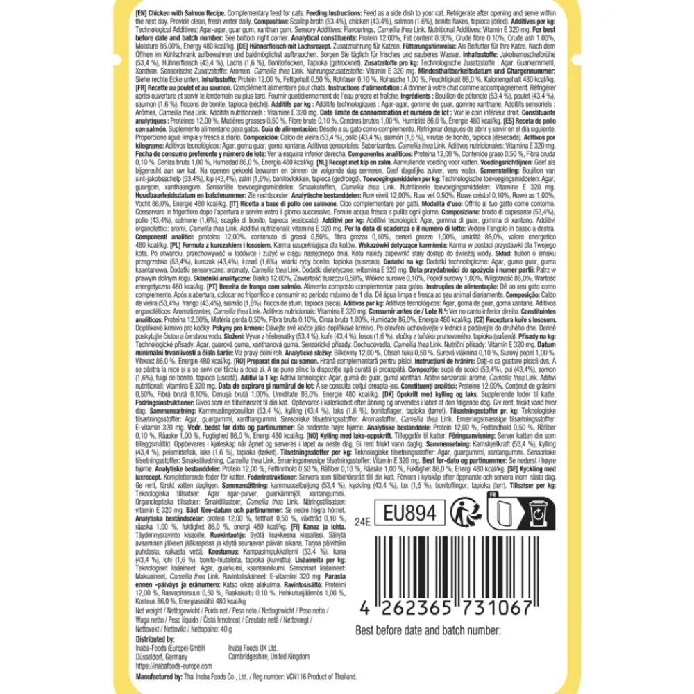 Bouillon van sint-jakobsschelp (53,4%), kip (43,4%), zalm (1,6%), bonitovlokken, tapioca (gedroogd).