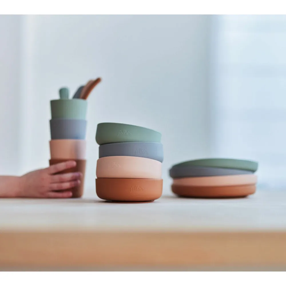 Dit kinderservies van Jollein is gemaakt van 100% siliconen. De set bestaat uit vier delen: een kommetje, een bordje, een lepeltje en een bekertje. Alle onderdelen kunnen in de vriezer, magnetron en oven. Ook is de set bestendig tegen de vaatwasser. Aan de onderkant van het kommetje en het bordje zit een handige zuignap.