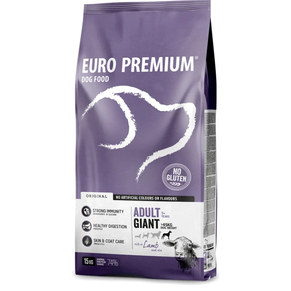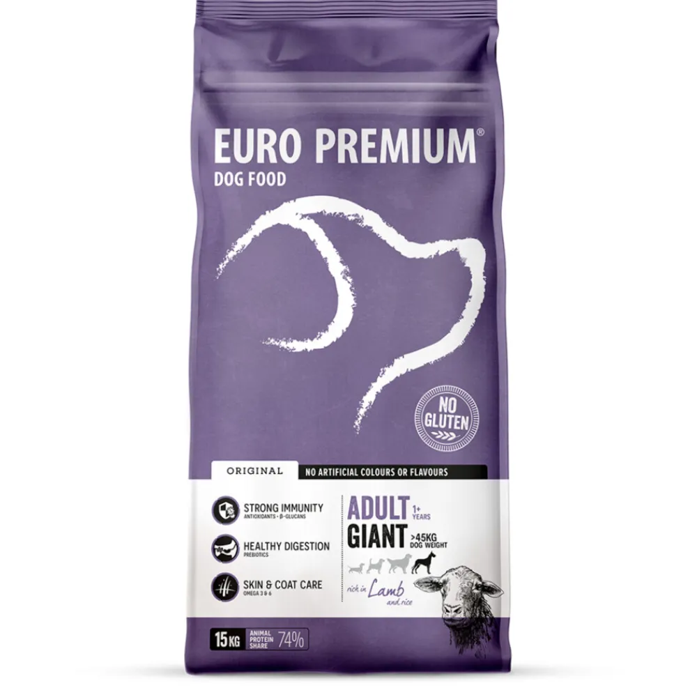 Euro-Premium Adult Giant Lam & Rijst is een volledige, super-premium voeding voor volwassen honden van grote rassen (vanaf 1 jaar en vanaf 45kg volwassen gewicht). Deze voeding is speciaal samengesteld voor honden die een grote brok verkiezen. Een optimale weerstand en een gezonde spijsvertering worden ondersteund door de toevoeging van een unieke blend van plantenextracten – rijk aan antioxidanten – aangevuld met prebiotica en β-glucanen.