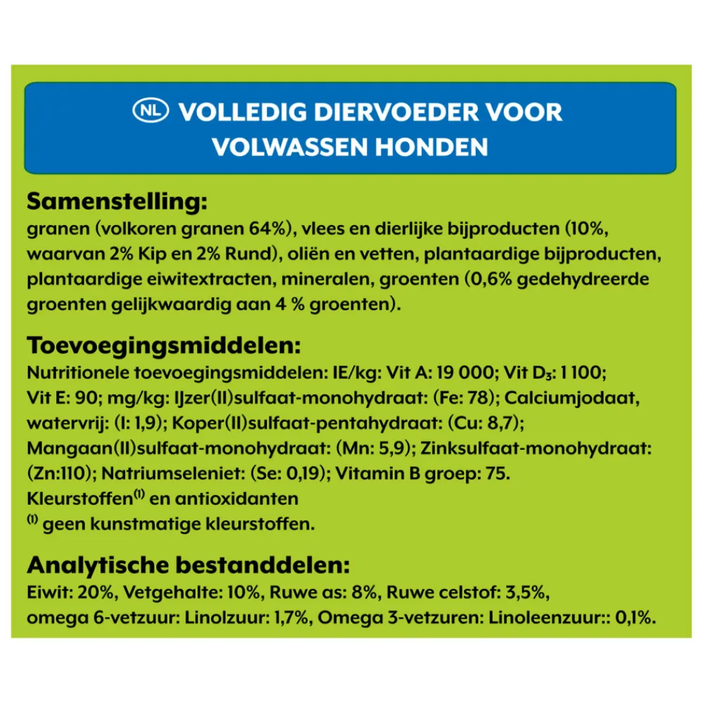 Granen (volkoren granen 64%), vlees en dierlijke bijproducten (10%, waarvan 2% Kip en 2% Rund), oliën en vetten, plantaardige bijproducten, plantaardige eiwitextracten, mineralen, groenten (0,6% gedehydreerde groenten, gelijkwaardig aan 4%% groenten).