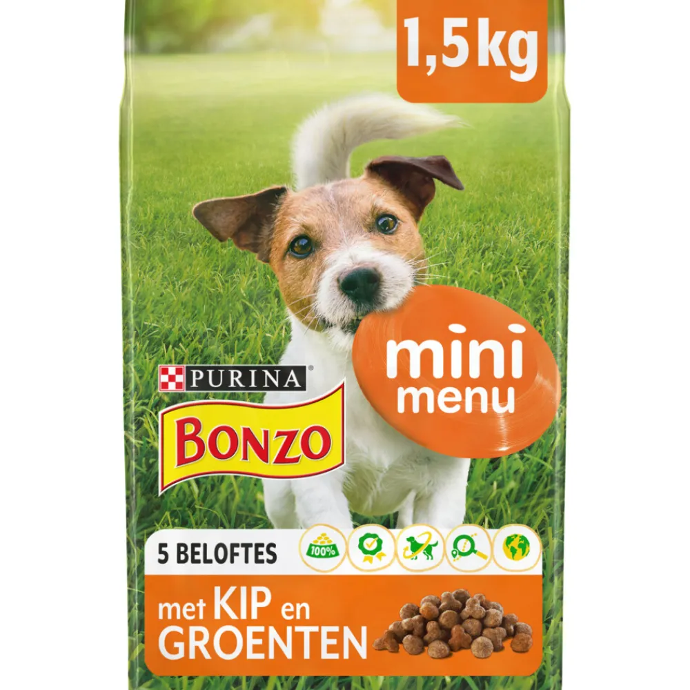 Bonzo Mini Menu met Kip en groenten is een heerlijk recept met kip, gecombineerd met volkoren granen, B vitamen en Omega 3&6 vetzuren. Bonzo Mini Menu, een heerlijke maaltijd met kleinere brokjes speciaal ontwikkeld voor jouw kleine hond. Het is 100% compleet en uitgebalanceerd en gemaakt met kwalitatief hoogwaardige ingrediëten en vezels voor een gezonde spijsvertering.