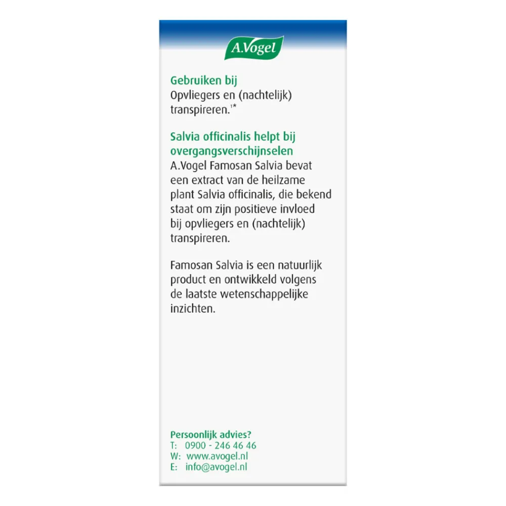 Famosan Salvia Overgang van A.Vogel is een natuurlijk product voor vrouwen in de overgang. Famosan Salvia is ontwikkeld volgens de laatste wetenschappelijke inzichten. Het bevat Salvia-extract, dat je lichaam op 100% natuurlijke wijze ondersteunt*. Bovendien blijft het natuurlijke overgangsproces gewoon intact*. Famosan Salvia Overgang helpt specifiek bij de overgangsverschijnselen opvliegers, nachtelijk transpireren en zweten1*. Het advies is het product minimaal 4-6 weken achtereen te gebruiken.