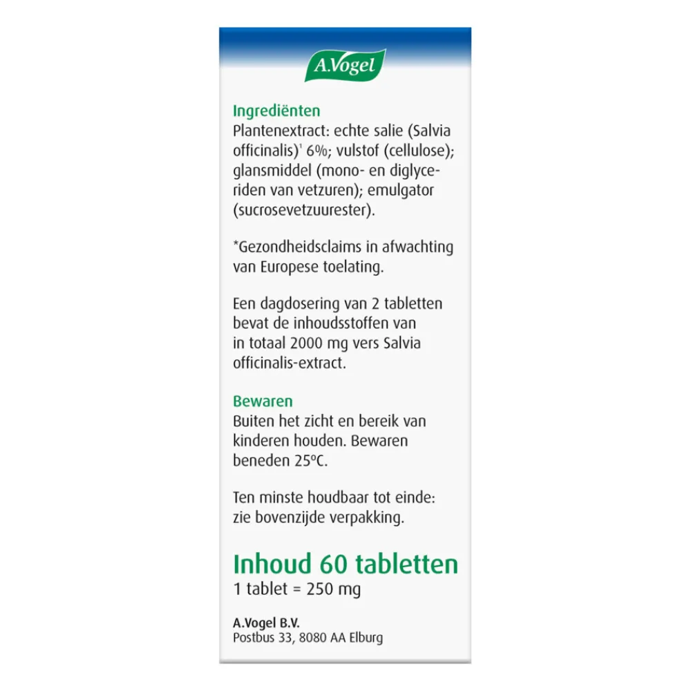 Een dagdosering van 2 tabletten bevat de inhoudsstoffen van in totaal 2000 mg vers Salvia officinalisextract.