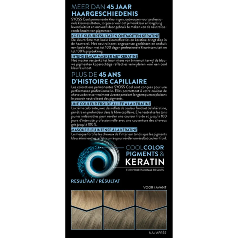 SYOSS permanente haarkleuringen, ontworpen voor professionele resultaten, zorgen ervoor dat je haarkleur er langdurig levend uitziet en aanvoelt. De kleurcrème, met rijke kleurpigmenten en keratine, dringt diep in de haarvezel om tot 100 dagen professionele kleurintensiteit en tot 100 % grijsdekking te garanderen. Het intens verzorgend masker met keratine versterkt het haar intens van binnenuit en maakt het haaroppervlak glad: de kleurpigmenten worden goed vastgelegd en onthullen de levendigste en rijkste kleuren van SYOSS.