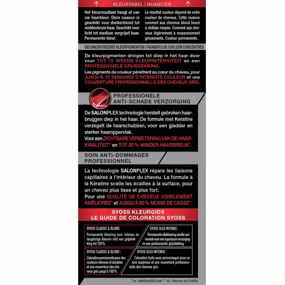 De kleurpigmenten van Syoss Baseline dringen tot diep in het haar door voor tot 10 weken kleurintensiteit en een professionele grijsdekking. De SALONPLEX technologie herstelt gebroken haarbruggen diep in het haar en de formule met Keratine verzegelt de haarschubben voor een gladder en sterker haaroppervlak. Syoss Baseline haarverf zorgt voor een zichtbare verbetering van de haarkwaliteit* en tot 80% minder haarbreuk*.* vs. onbehandeld haar.