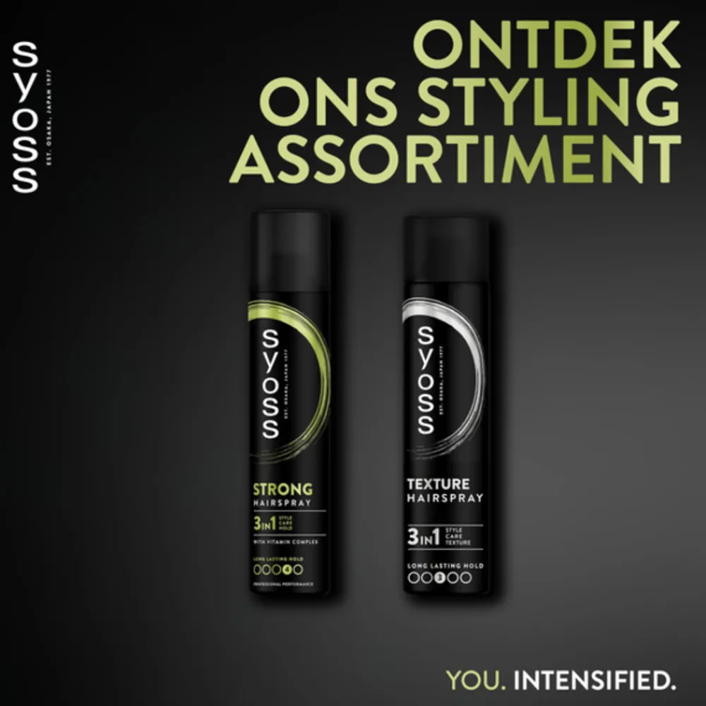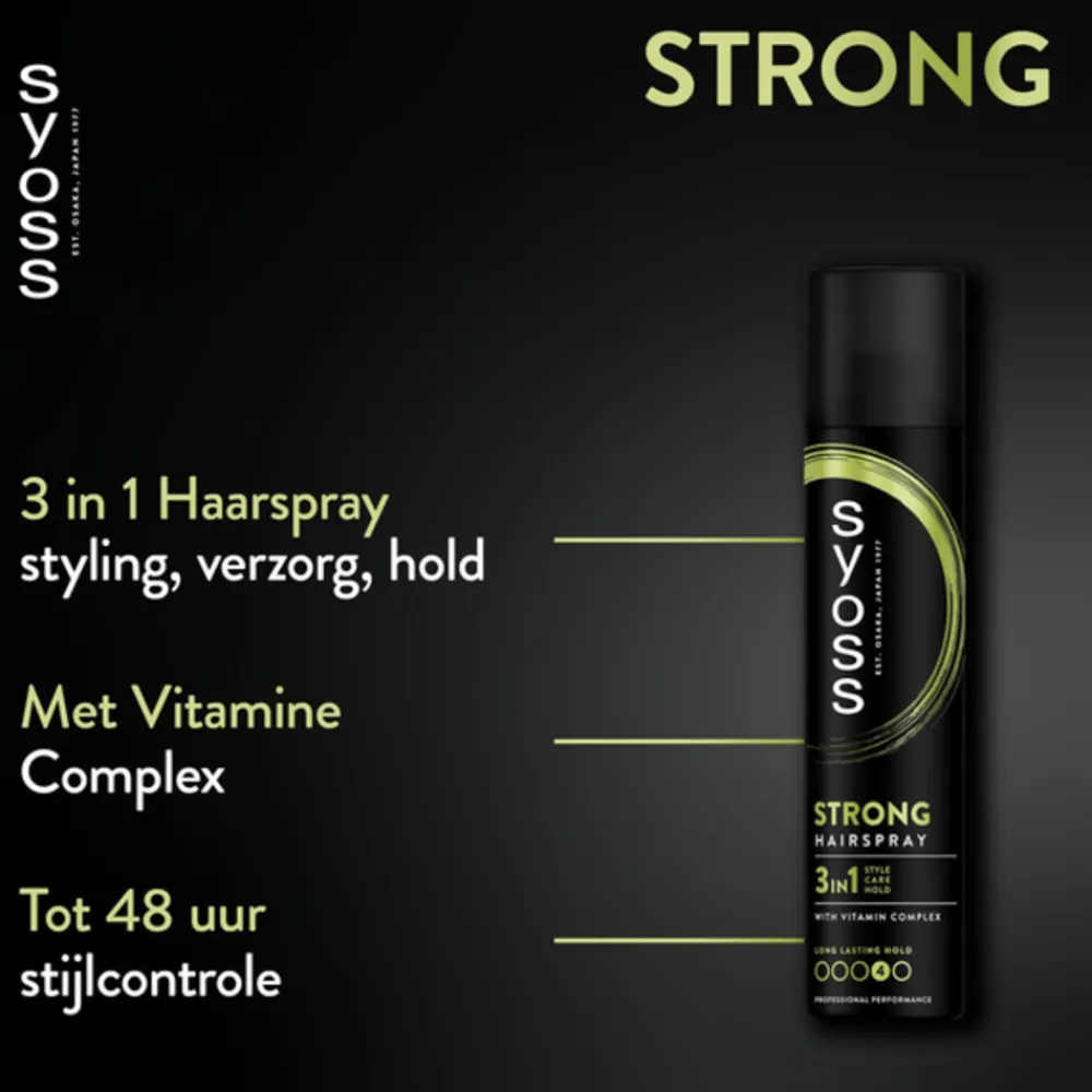 Breng het gevoel dat je net van de kapper komt thuis tot leven met Syoss! De salon- geïnspireerde Syoss Strong Haarspray, ontwikkeld met en getest door kappers, geeft een sterke fixatie en tot 48 uur style-controle. voor perfecte salon looks thuis. De 3 in 1 formule: styling, verzorging, herstel – bevat een Vitaminecomplex, een combinatie van Panthenol en Niacinamide, voor een versterkte haarstructuur.