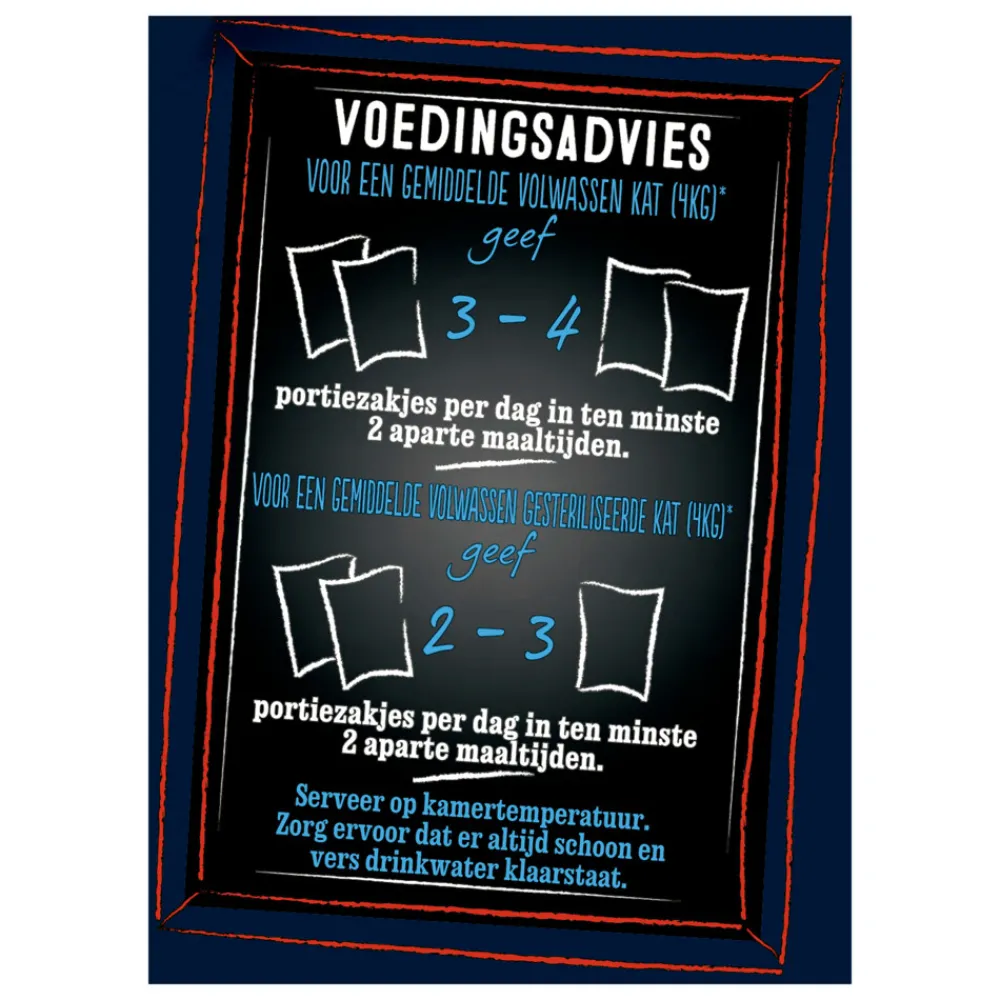Voor een gemiddelde volwassen kat (4kg) geef 3 tot 4 portiezakjes per dag in ten minste 2 aparte maaltijden.