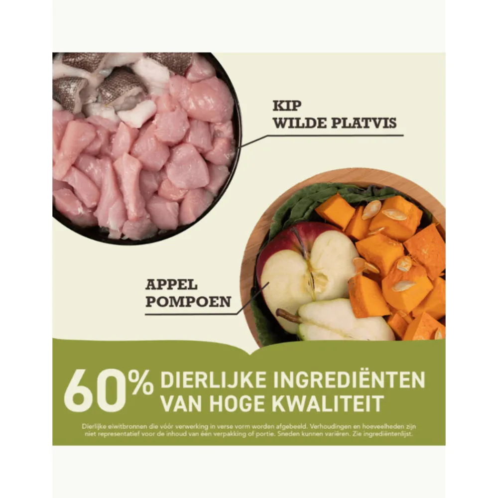 Verse kip (16%), kippenvlees meel (15%), hele rode linzen, hele groene erwten, hele kikkererwten, kalkoenvlees meel (4,5%), kippen vet (4%), vers kippen orgaanvlees (lever, hart) (4%), haring meel (4%), eieren (4%), rauwe platvis (4%), visolie (4%), hele groene linzen, hele gele erwten, erwten vezel, erwtenzetmeel, rauwe kalkoen lever (0,5%), zout, gedroogd zeewier, verse hele pompoen, verse hele muskaat pompoen, verse hele wortels, verse hele appels, verse hele peren, verse hele courgette, gedroogde cichoreiwortel, verse boerenkool, verse spinazie, verse raapstelen, vers bieten loof, verse hele cranberry, verse hele bosbes, verse hele saskatoon berries, kurkuma, mariadistel, kliswortel, lavendel, heemstwortel, rozenbottels.