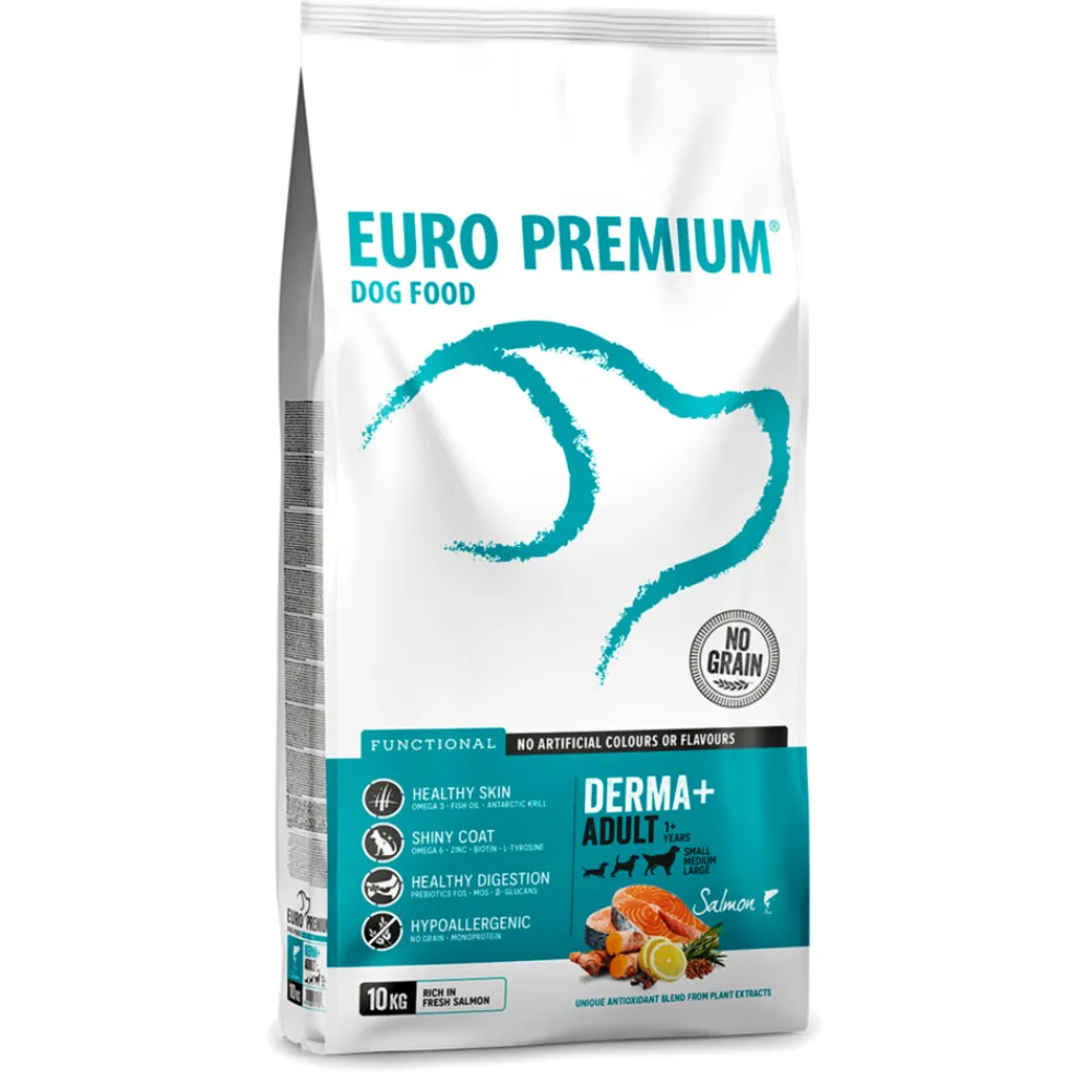 Euro Premium Derma+ rijk aan verse zalm is een super-premium hondenvoeding voor een gezonde huid en vacht. Sommige honden reageren gevoelig op bepaalde ingrediënten met huidreacties tot gevolg. Deze hypoallergene receptuur is samengesteld zonder granen en bevat zalm als alternatieve, enkelvoudige dierlijke eiwitbron. Het gebruik van verse zalm bevordert de opname van dierlijke eiwitten. Zalm, samen met Antarctische krill en visolie zorgen voor een optimale hoeveelheid Omega-3 vetzuren voor een gezonde huid en vacht. Daarnaast ondersteunen Omega-6 vetzuren, zink en biotine de huid- en vacht kwaliteit. L-tyrosine intensiveert pigmentatie van de zwarte vacht. De prebiotica F.O.S., M.O.S. en β-glucanen dragen bij tot een gezonde darmflora.