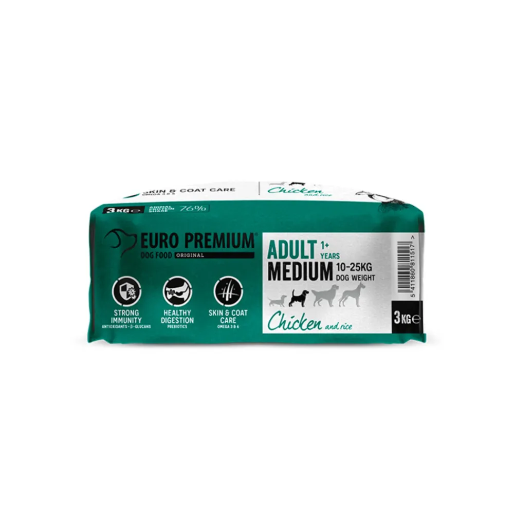 Euro-Premium Adult Medium – Chicken & Rice is een volledige, super-premium voeding voor volwassen honden van middelgrote rassen (vanaf 1 jaar en 10 – 25kg volwassen gewicht).