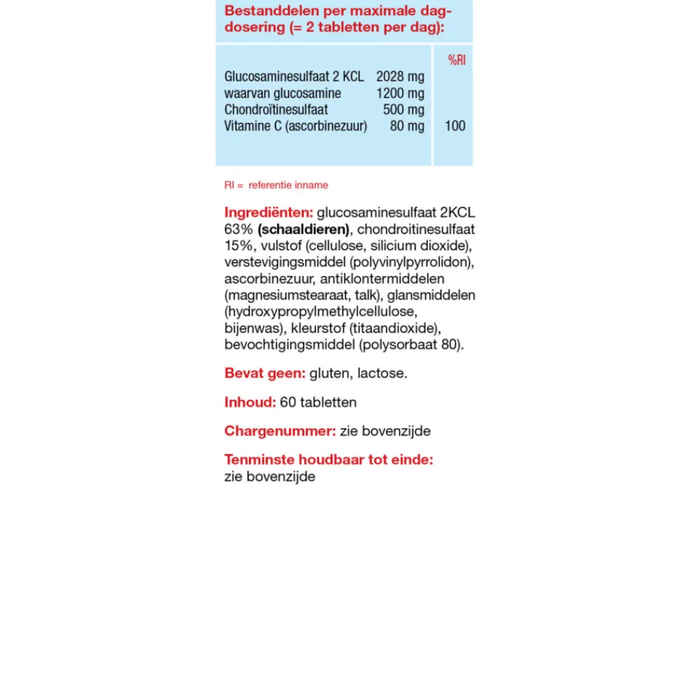 1200 mg Glucosamine (gedoseerd als glucosaminesulfaat 2KCL), 500 mg Chondroitinesulfaat, 80 mg Vitamine C (100% ADH) en 500 mg MSM. (ADH= Aanbevolen Dagelijkse Hoeveelheid). Bevat geen gluten, gist, lactose, suiker, kunstmatige kleurstoffen, smaakstoffen of conserveermiddelen. Allergenen informatie: product op basis van schaaldieren.