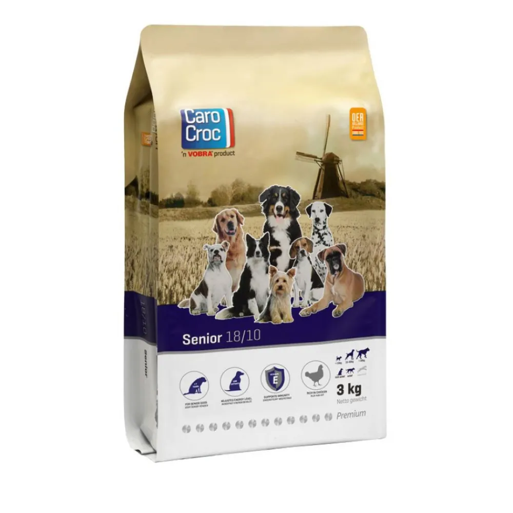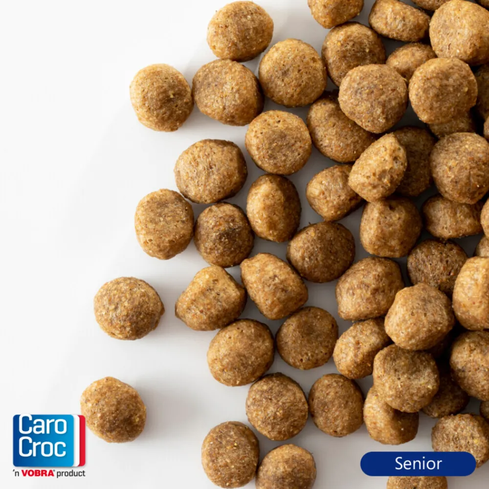 CaroCroc Senior voeding is speciaal afgestemd op jouw senior hond. Vanaf 7 jaar kan jouw hond verouderingsverschijnselen vertonen. De stofwisseling gaat trager werken en het activiteitsniveau kan afnemen. Dit betekenr dat de energiebehoefte van jouw hond verandert. Het is belangrijk om het voer hierop aan te passen.