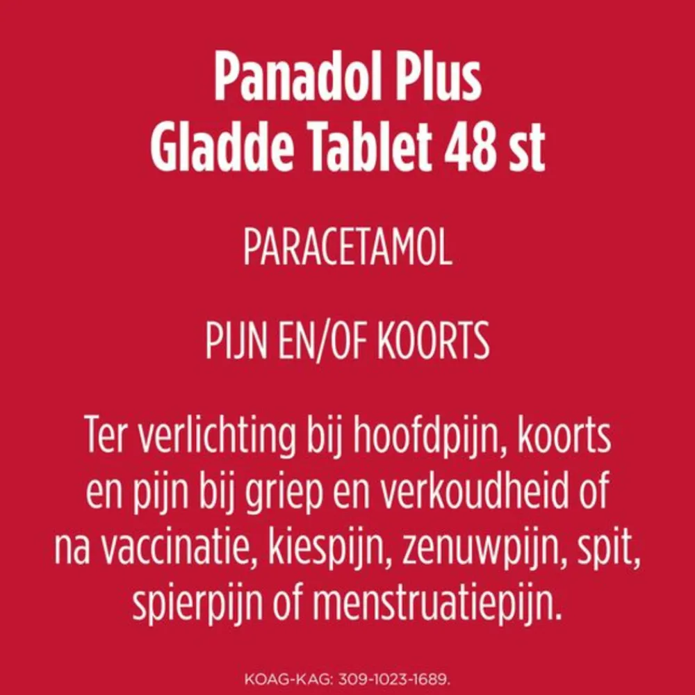 Panadol Plus is een pijnstiller op basis van paracetamol en coffeïne. Coffeïne heeft een versterkende werking op paracetamol. Je kunt Panadol Plus gebruiken bij hoofdpijn, kiespijn, spierpijn, spit, zenuwpijn, menstruatiepijn, koorts en pijn bij griep en verkoudheid, koorts en pijn na inenting of vaccinatie. Paracetamol werkt pijnstillend en koortsverlagend. Bij milde pijnen is in de meeste gevallen paracetamol de eerste en beste keus. De tabletten zijn glad waardoor je ze makkelijk door kunt slikken zijn. Panadol Plus is niet geschikt voor kinderen onder de 12 jaar. Panadol Plus is een geneesmiddel. Deze verpakking bevat 48 gladde tabletten. Lees voor gebruik de bijsluiter.