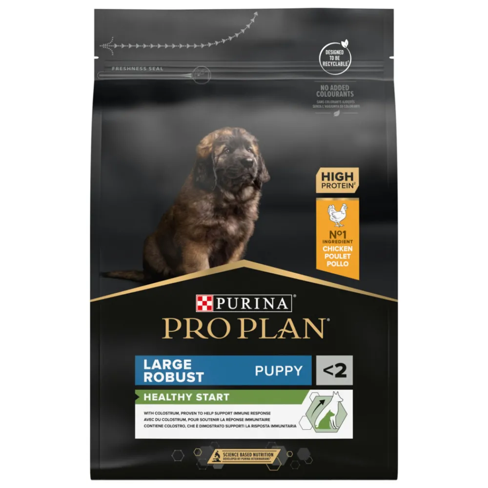 Pro Plan Puppy Large Robust Healthy Start Kip (voorheen Optistart) is een complete voeding voor puppy’s van grote rassen met een atletische bouw. PRO PLAN® Large Robust Puppy met OPTISTART® hondenvoer bevat alle voedingsstoffen die een puppy nodig heeft om in zijn behoefte te voorzien. Ook geschikt voor drachtige of zogende teven. Deze formule bevat OPTISTART®, een combinatie van ingrediënten met onder anderen colostrum, een voedingsstof welke aanwezig is in de eerste moedermelk en helpt de natuurlijke afweer van de puppy te versterken. Rijk aan kip van hoge kwaliteit. Deze voeding is samengesteld door Purina deskundigen om gezonde gewrichten, de lange termijn gezondheid en de natuurlijke weerstand te helpen ondersteunen.
