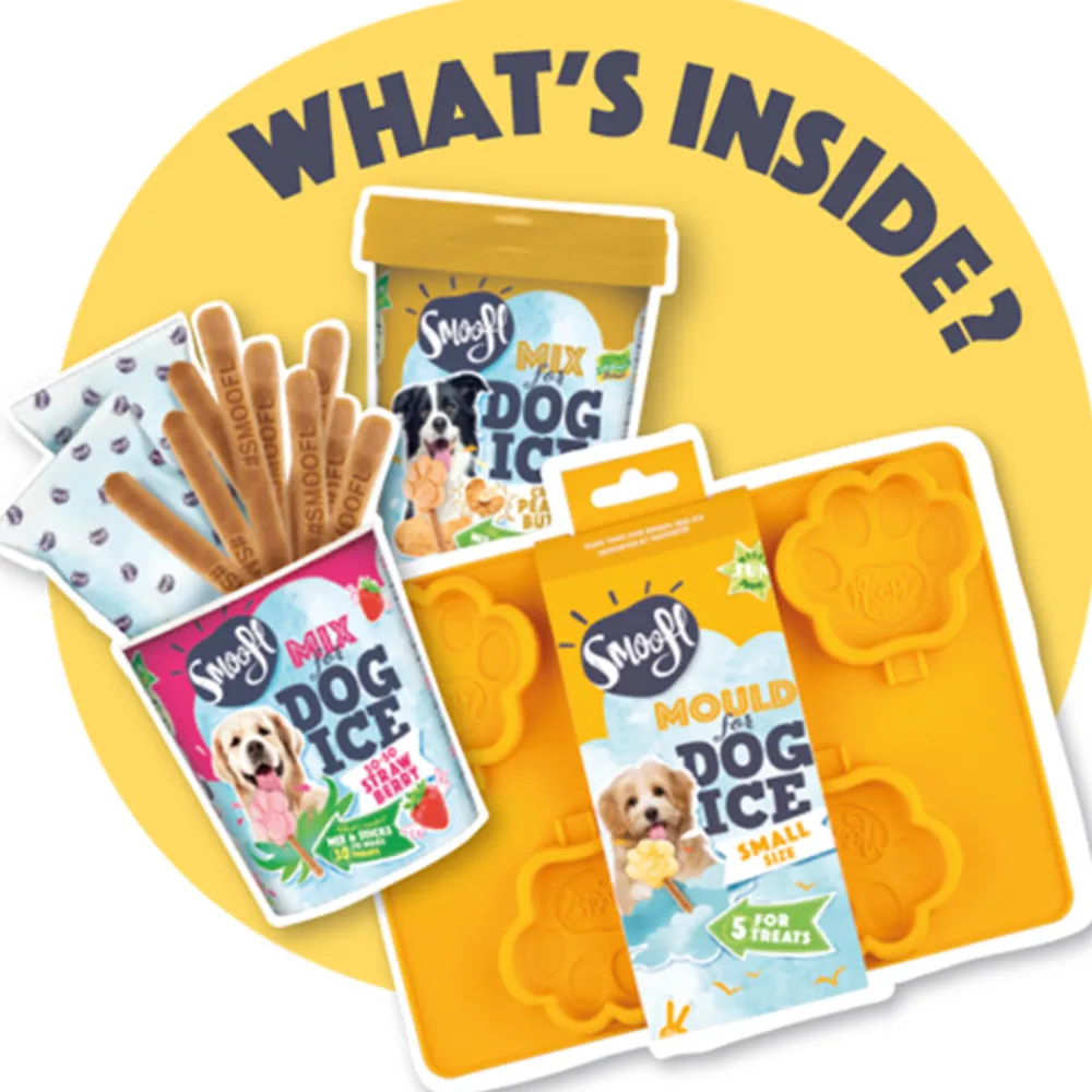 De kit bevat de Aardbei en Pindakaas Mix voor Dog Ice, eetbare Joy Sticks en de Small ijsvorm. Wat wil je nog meer?