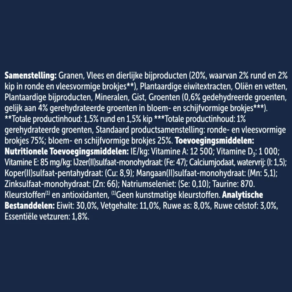 Granen, Vlees en dierlijke bijproducten (10 %*), Plantaardige eiwitextracten, Oliën en Vetten, Plantaardige bijproducten, Mineralen, Gist, Groenten (groene en oranje brokjes: 0,13 % gedroogde groenten gelijk aan 1 % groenten). *gelijk aan 20 % gerehydrateerd vlees en dierlijke bijproducten, met min. 4 % rund in de rode en bruine steak brokjes en met min. 4 % kip in de rode, bruine en lichtbruine brokjes.