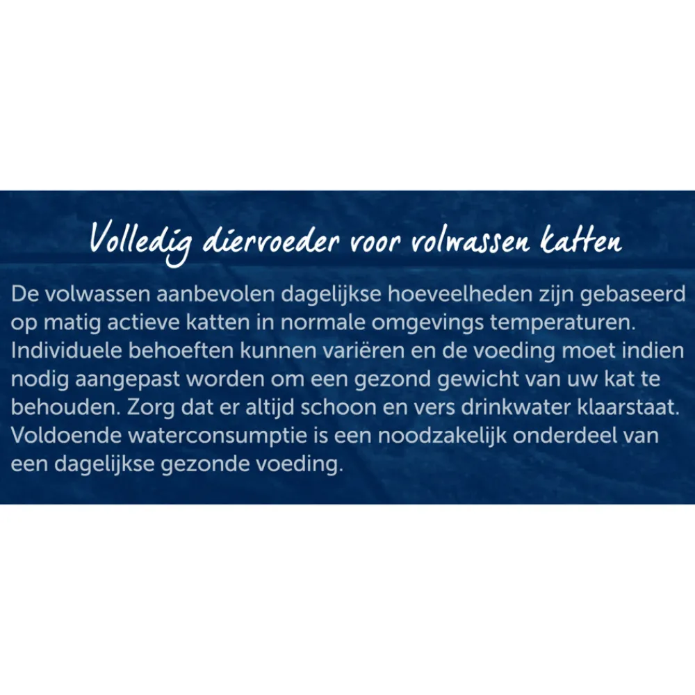 De aangegeven hoeveelheden zijn gemiddelden gebaseerd op de behoefte van normale actieve, volwassen katten in een normale omgevingstemperatuur. Individuele behoeften varieren en de voeding moet indien nodig aangepast worden om het gezone gewicht van je kat te behouden.