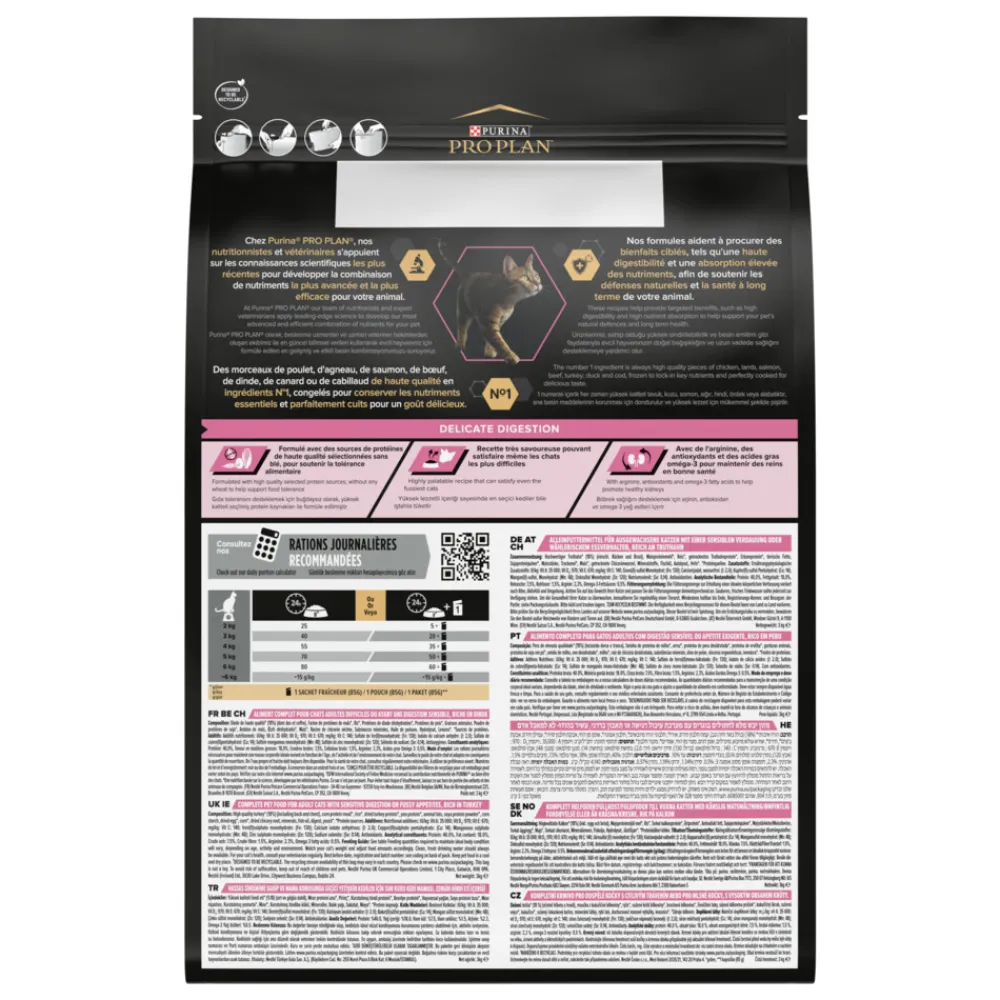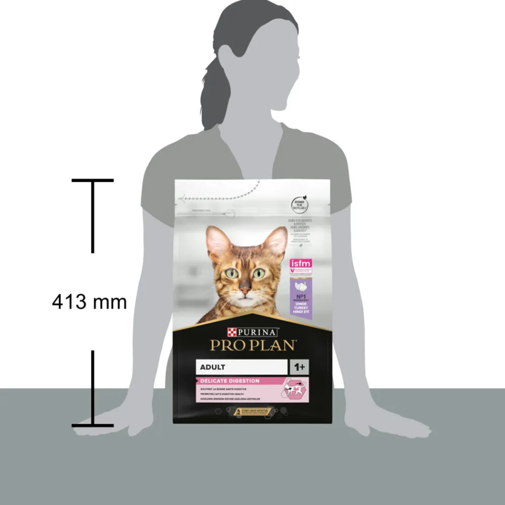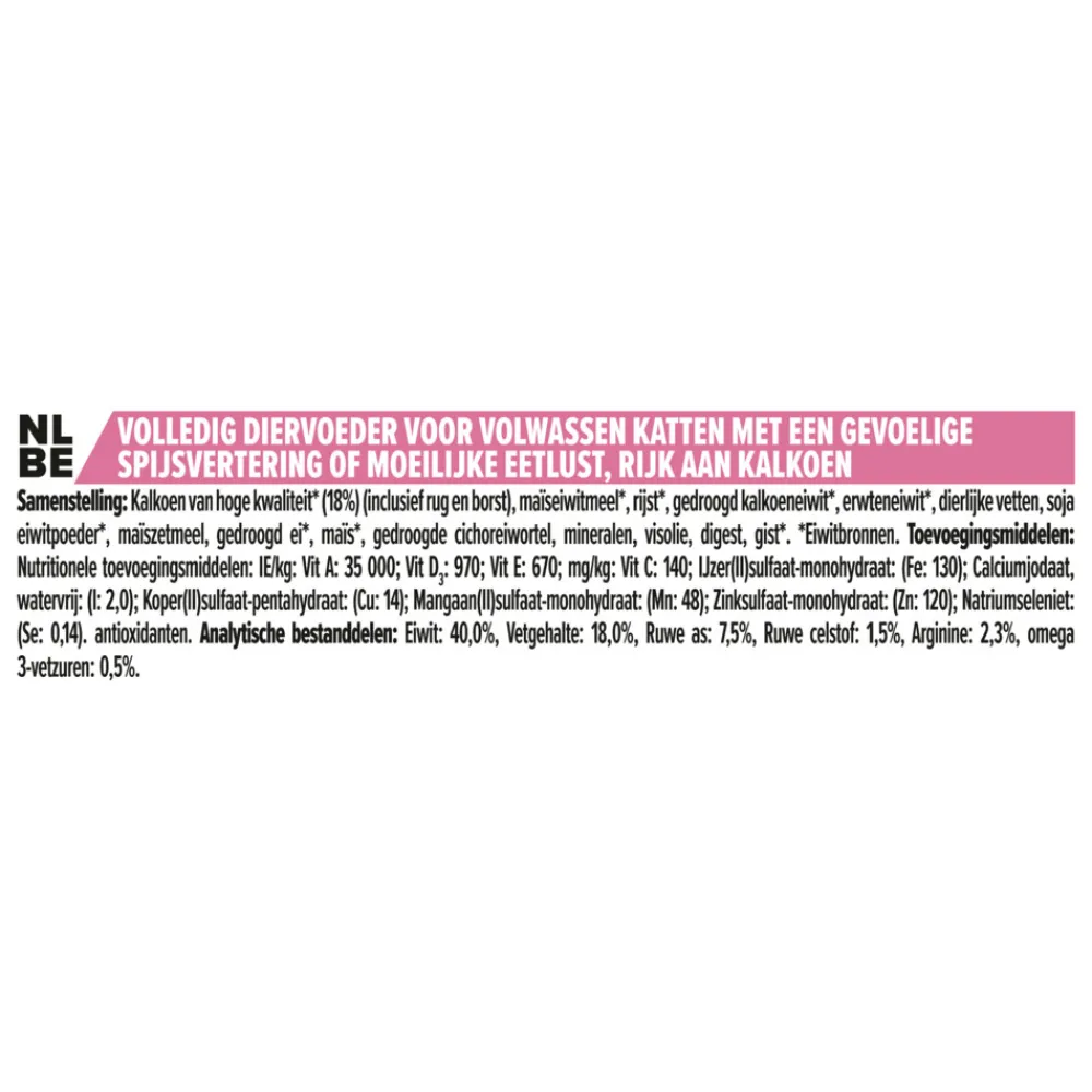 Pro Plan Adult Delicate Digestion Kalkoen (voorheen OptiDigest) is een volledige en droge voeding wetenschappelijk samengesteld voor volwassen katten met een gevoelige spijsvertering. De voeding bevat alle voedingsstoffen die jouw kat nodig heeft voor de dagelijkse vitaliteit en gezondheid op de lange termijn. Delicate Digestion, aantoonbare ondersteuning van een gezonde spijsvertering dankzij natuurlijke prebiotica.