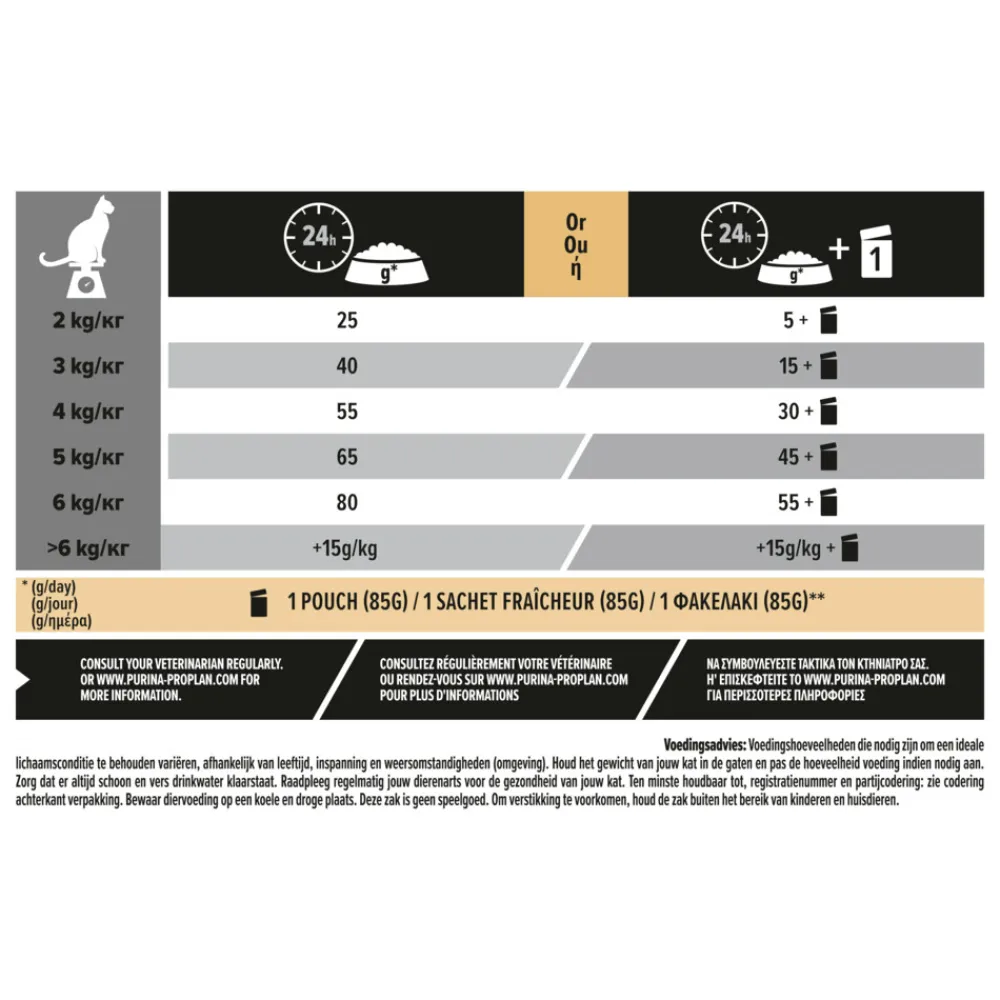 Voedingshoeveelheden die nodig zijn om een ideale lichaamsconditie te behouden variëren, afhankelijk van leeftijd, inspanning en weersomstandigheden (omgeving). Houd het gewicht van je kat in de gaten en pas de hoeveelheid voeding indien nodig aan. Zorg ervoor dat er altijd schoon en vers drinkwater klaarstaat. Raadpleeg regelmatig je dierenarts voor de gezondheid van je kat.