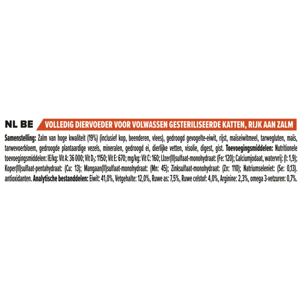 De samenstelling is deskundig uitgebalanceerd om gesteriliseerde/gecastreerde katten te helpen om gezond te blijven tijdens hun volwassen jaren. Het eiwitgehalte, vetgehalte en koolhydraatgehalte is speciaal aangepast om gesteriliseerde/gecastreerde katten te helpen om het ideale lichaamsgewicht te behouden. De knapperige brokjes textuur heeft bewezen de tanden te beschermen tegen de opbouw van tandplak en tandsteen.