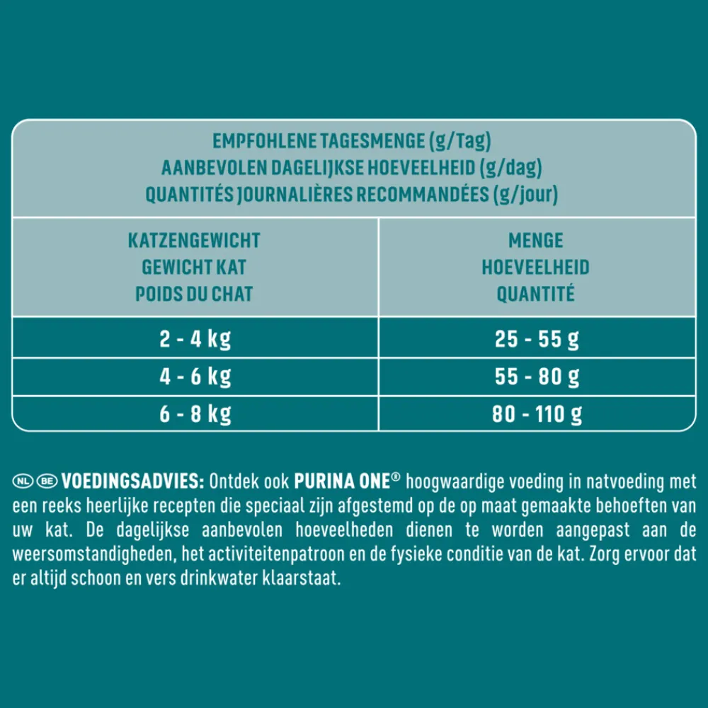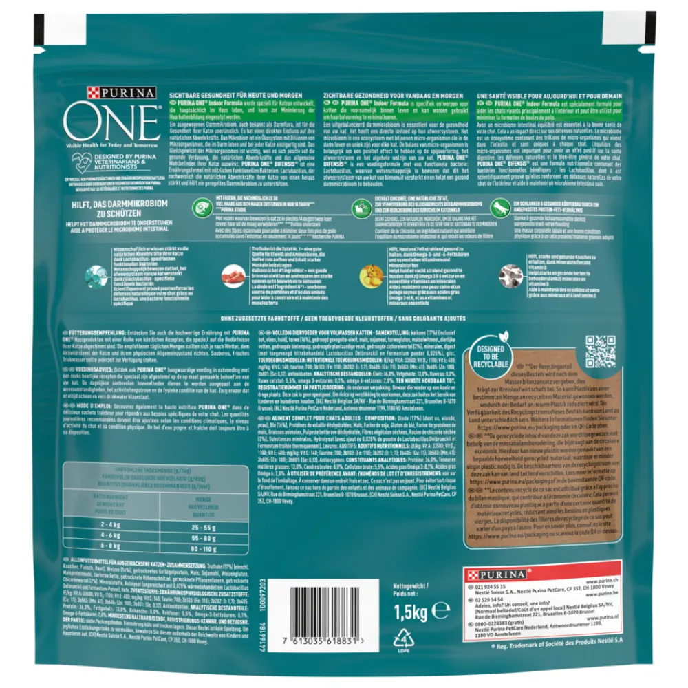 Purina ONE Indoor Formula is speciaal ontworpen door dierenartsen en voedingsdeskundigen voor katten die voornamelijk binnen blijven. Purina ONE Indoor Formula, bevat kalkoen en volkoren granen en biedt alle essentiële voedingsstoffen die nodig zijn om haar gezondheid te ondersteunen. De voeding is aangepast aan de behoeftes van binnenkatten en helpt haarbalvorming te verminderen.