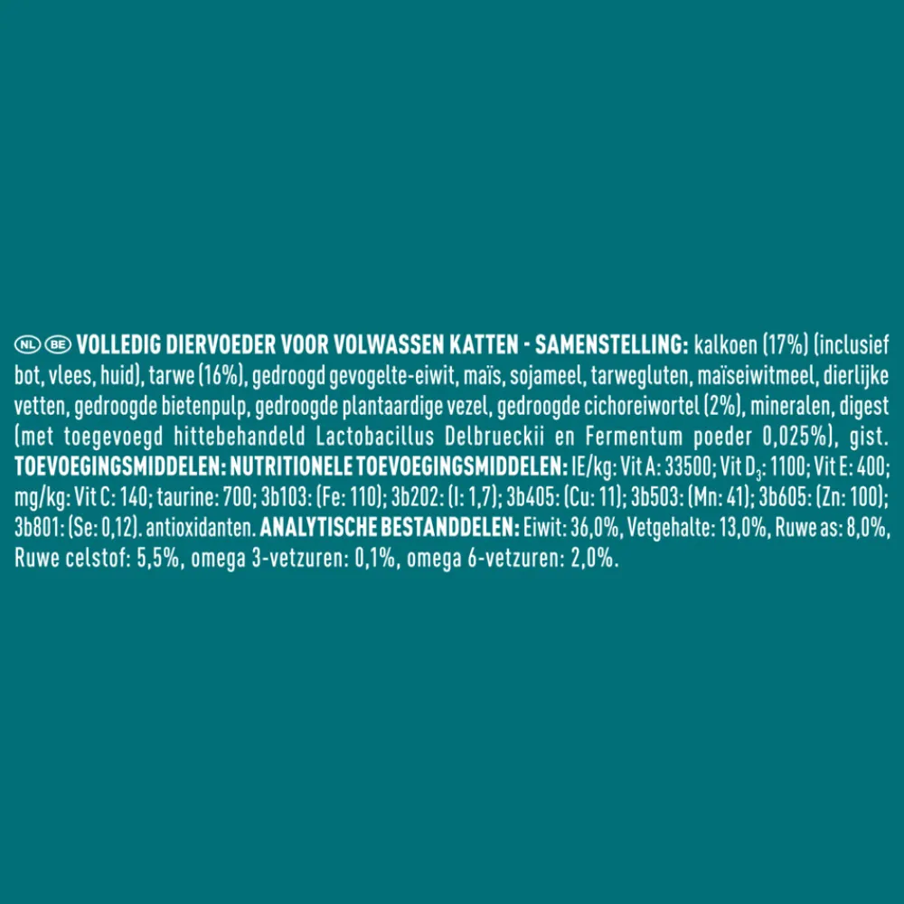 Kalkoen (17%), volkoren tarwe (17%), gedroogd gevogelte-eiwitten, maïs, sojameel, maïsglutenmeel, tarweglutenmeel, dierlijk vet, gedroogde bietenpulp, gedroogde cichoreiwortel (2%), mineralen, digest (met toegevoegd hittebehandeld Lactobacillus Delbrueckii en Fermentum-poeder 0,025%), gist.