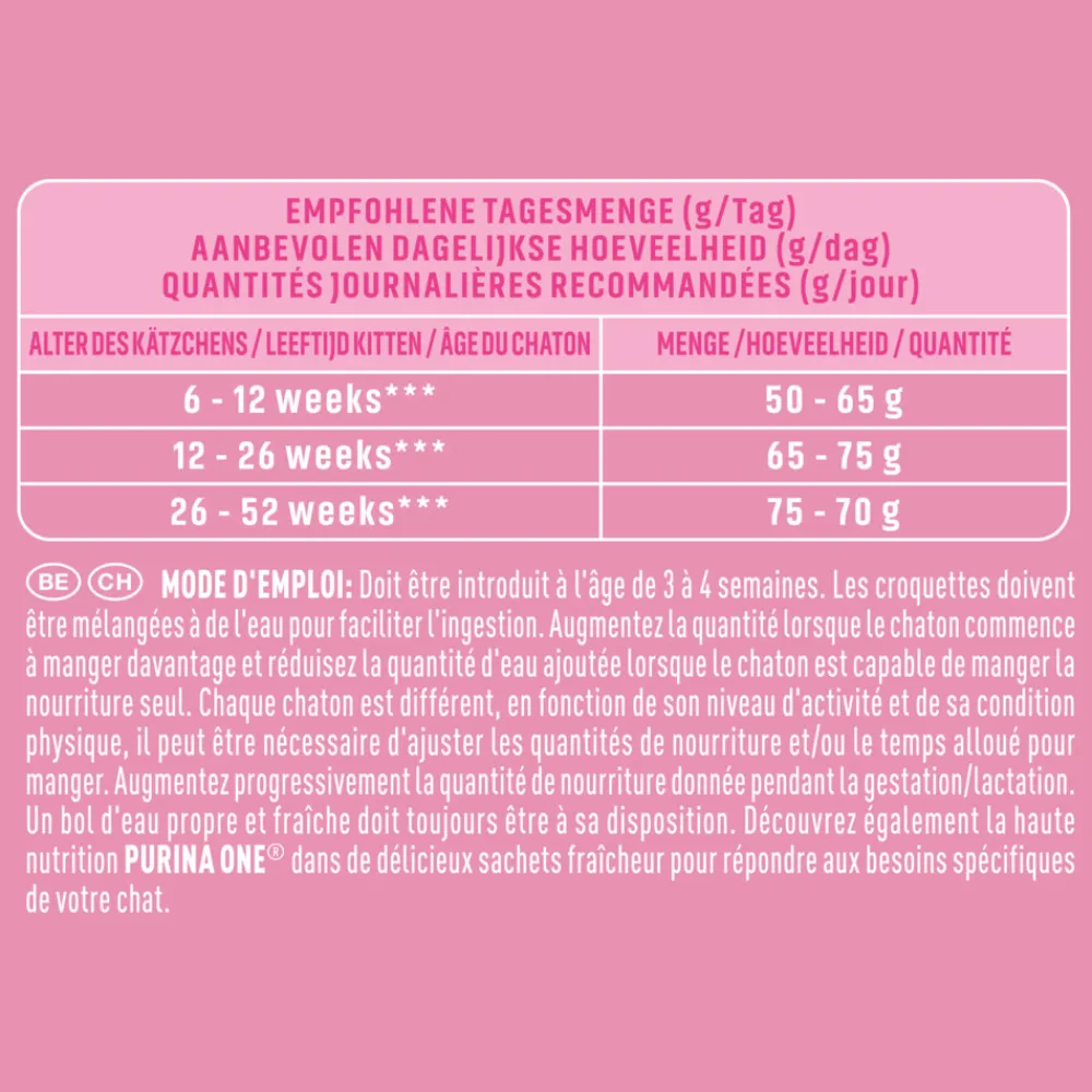 Kittens bevinden zich in een fase van intense groei en ontwikkeling. Hun voedingsbehoeften zijn zeer veeleisend voor deze hoge groeisnelheid. Purina ONE Junior is speciaal ontwikkeld om te voldoen aan de voedingsvereisten van kittens (van spenen tot 12 maanden) en drachtige of zogende katten.