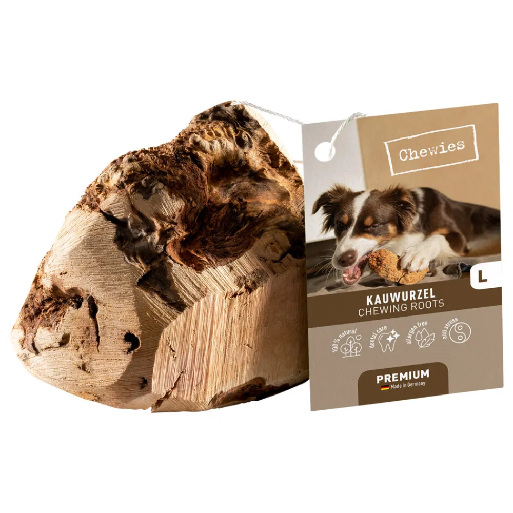 Chewies Kauwwortel Hondensnack maat L is ontworpen voor grote honden die een krachtige kauwsnack nodig hebben. Deze robuuste en bijna onverwoestbare kauwwortel biedt soortspecifieke activiteit en draagt bij aan het welzijn en geluk van je hond. De wortels zijn gemaakt van duurzaam, 100% natuurlijk en onbehandeld hout van de mediterrane heidestruik, afkomstig uit de Italiaanse bossen. De compacte structuur van de wortel stimuleert intensief knagen en kauwen. Deze veganistische kauwwortel is calorievrij en veiliger dan stokken uit het bos, omdat hij oplost in vlokkige plaatjes en zacht wordt met speeksel, wat inslikken onschadelijk maakt.