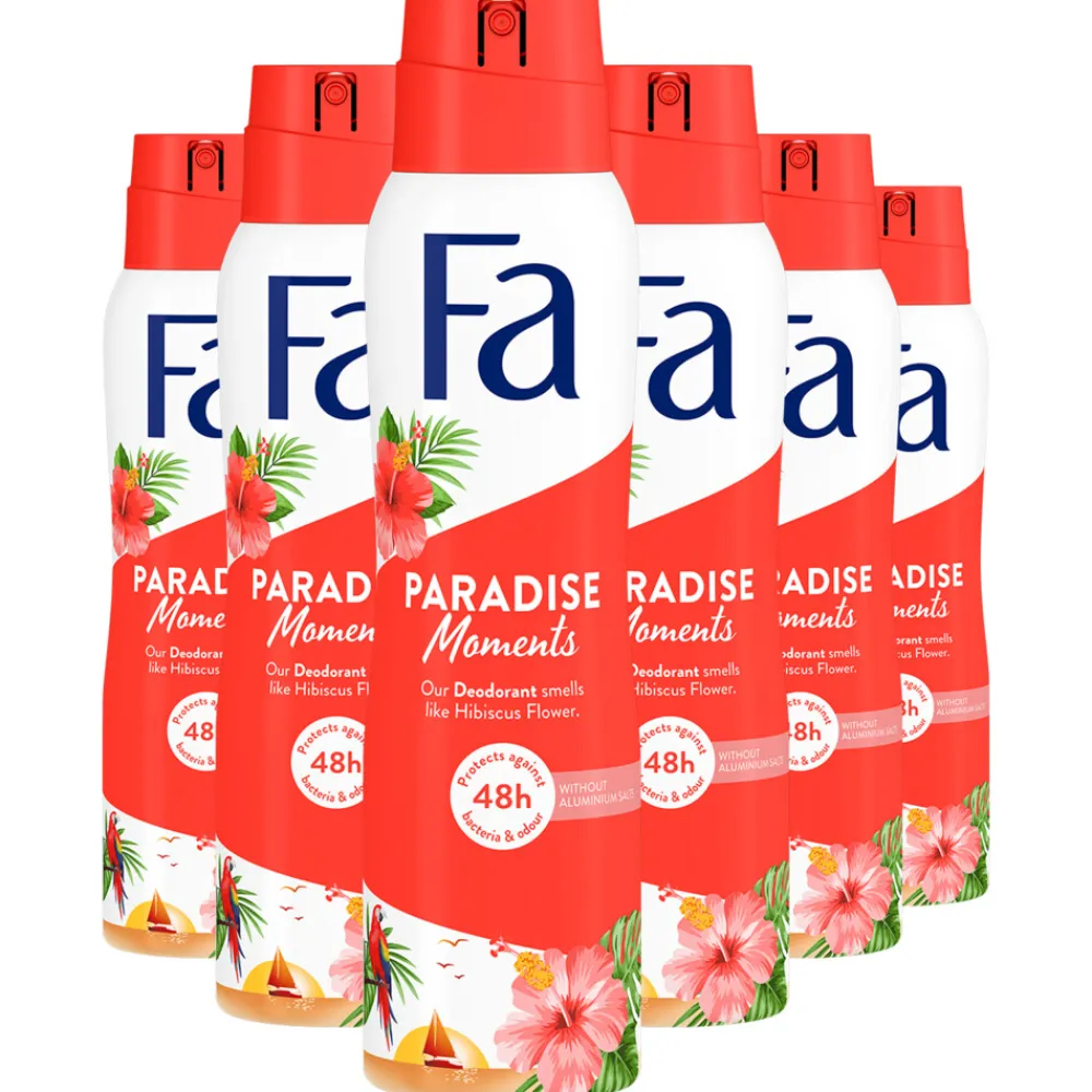 Ontdek Fa Paradise Moments deodorant spray met de geur van Hibiscusbloem. De vegan formule biedt 48 uur bescherming tegen nare geurtjes en is vrij van aluminiumzouten.