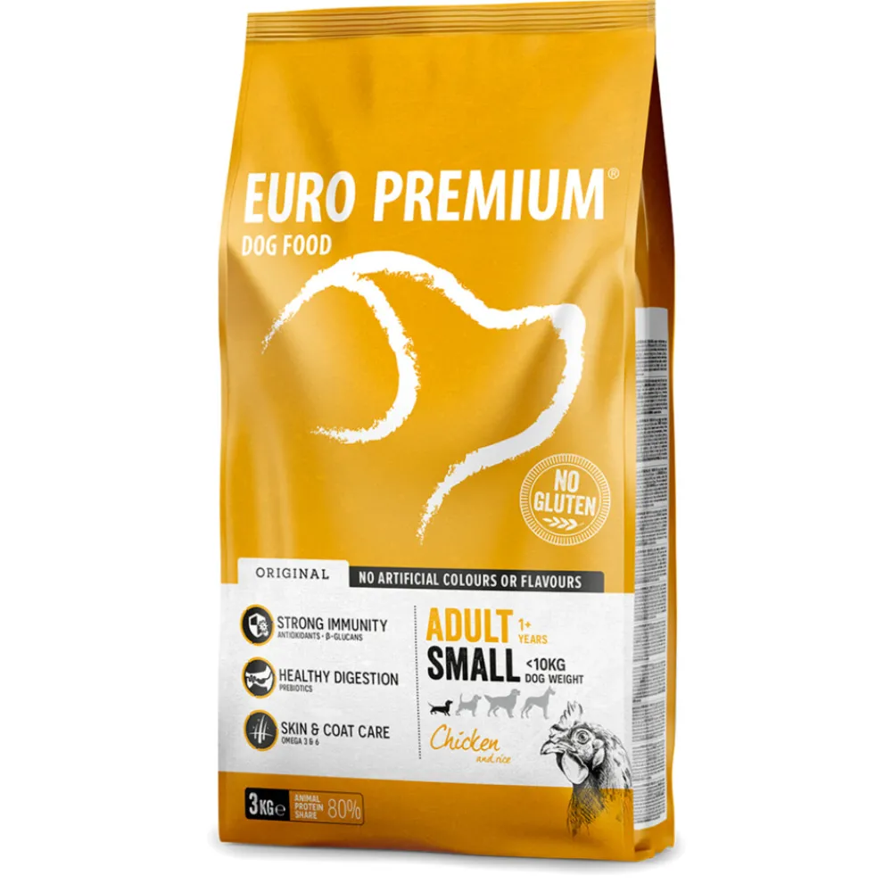 Euro-Premium Adult Small – Chicken & Rice is een volledige, super-premium voeding voor volwassen honden van kleine rassen (vanaf 1 jaar en tot 10kg volwassen gewicht). Deze energierijke voeding is speciaal samengesteld voor honden die een kleiner brokje verkiezen.
